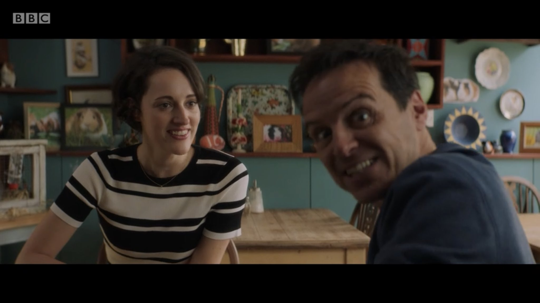 Everyone stops and stares at Fleabag. She’s shocked. She looks at him.